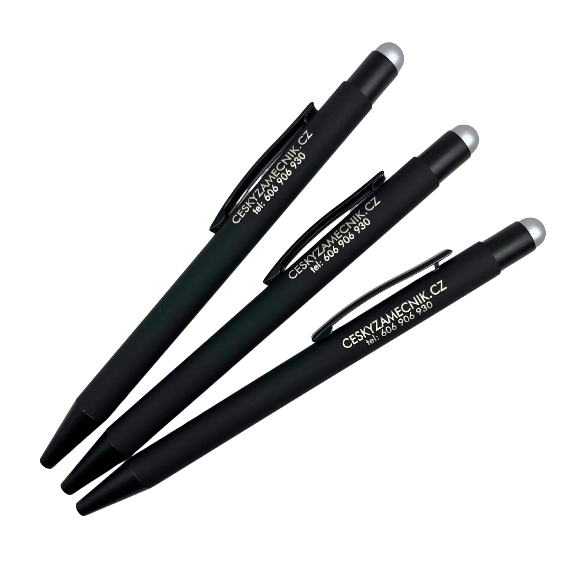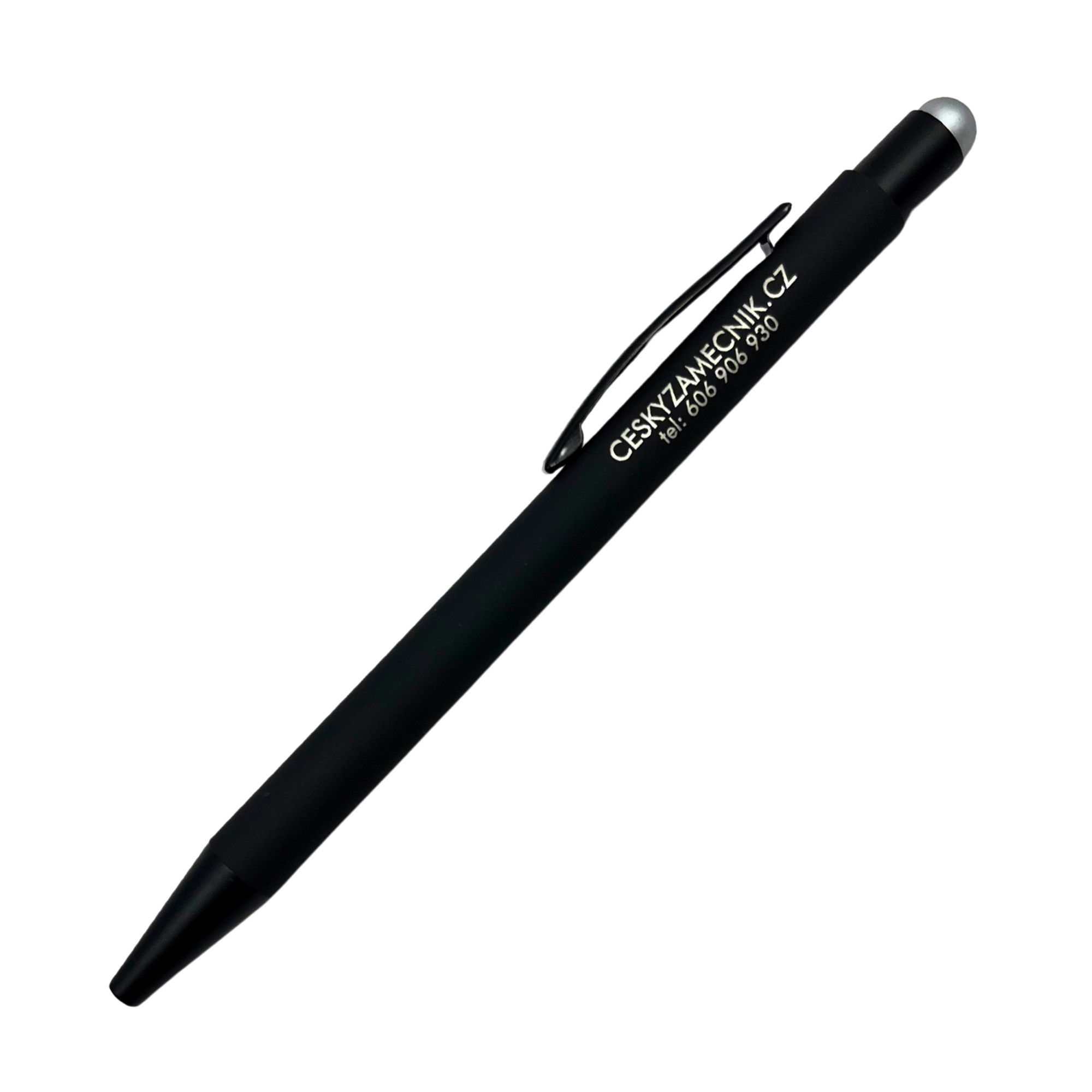 Elegantní kuličkové pero s dotykovým stylusem a tlačítkovým mechanizmem s vlastním potiskem s příjemným soft povrchem gravírování v barvě stylusu.